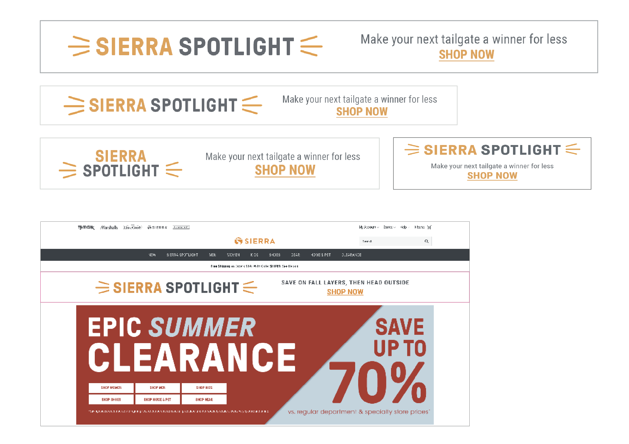 The Spotlight is a drive-to-shop engagement on the Sierra website. The Spotlight showcases curated shops based on the time of year or season. Highlighted in the most populated sections of the website through product ads, email banners, website banners, and multiple social media frames. Sierra is the only store in the TJX Family with a responsive website, as a designer, this means making each asset in 4 sizes to fit phones, laptops, tablets, and large computer screens. Gaining this knowledge gives me a new appreciation for web design and what goes into the work we absorb daily through social media.